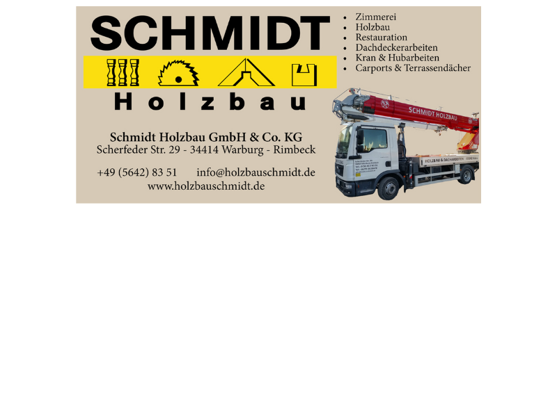 Schmidt Holzbau GmbH & Co. KG in Unternehmen +49 (5642) 83 51 info@holzbauschmidt.de www.holzbauschmidt.de Scherfeder Str. 29 34414 Warburg
